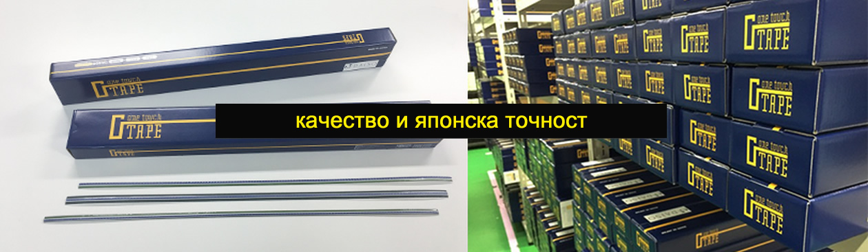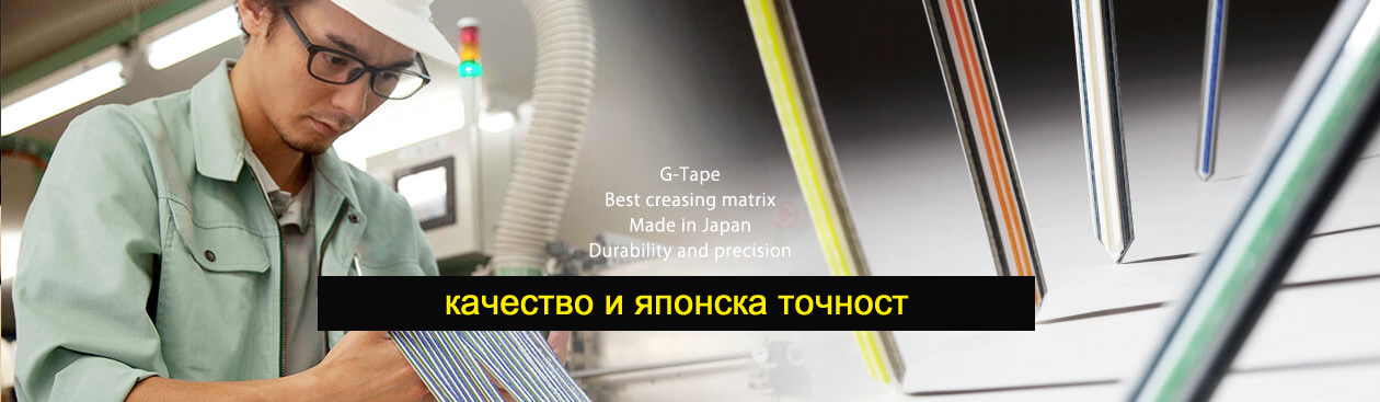 G-TAPE са контрабигове, японско производство, които възпрепятстват нацепването на линията на бига при следпечатното щанцоване. Контрабиговете G-TAPE нямат нужда от специална подготовка преди използване, тъй като монтажът им е изключително лесен. След стотици хиляди издържани тестове при щанцоване, G-TAPE се превърна в най-широко използваната система контрабигове в Япония (над 600 фирми в източна Япония и над 400 фирми в западна Япония). G-TAPE дава добри резултати при щанцоване на 200.000 – 300.000 бройки при нормален режим на работа или 500 000 бройки последователно щанцоване без нужда от пренастройване на машината. Освен стандартните модели, които предлагаме, ние също така изпълняваме специални поръчки. Присъстваме и на международния пазар.